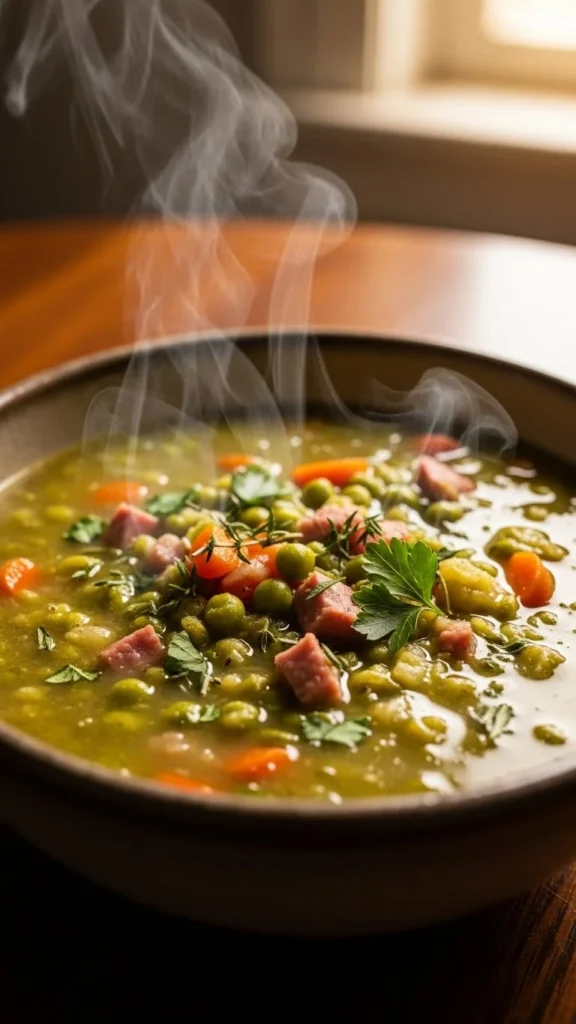 This soup is thick, rustic, and perfect for cold nights. The split peas soften into a rich texture that feels deeply comforting.