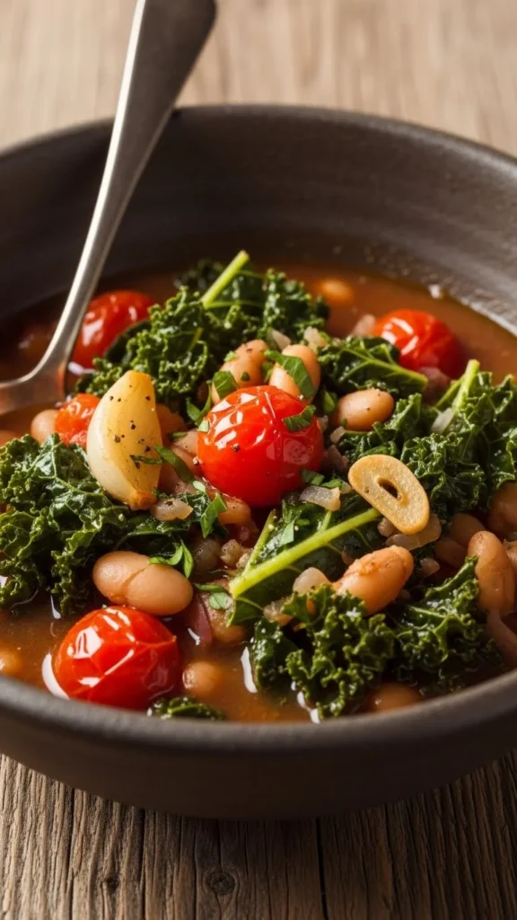This soup combines beans and kale with a tomato base that stays fragrant and comforting. It is hearty and packed with winter vegetables.