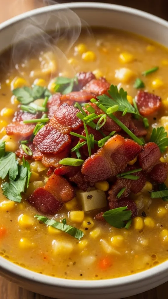 This soup is creamy and slightly sweet from the corn, balanced by salty bacon. Every spoonful brings satisfying warmth.