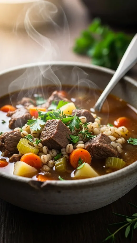 This soup offers deep comfort with tender beef, barley, and winter vegetables. The broth thickens gently as the barley softens. A reliable choice for long, cold evenings.