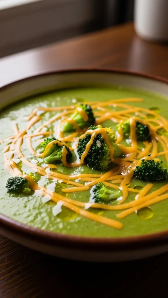 This creamy soup combines tender broccoli with rich cheddar for a satisfying winter bowl. The texture is thick and smooth with bits of soft broccoli throughout.