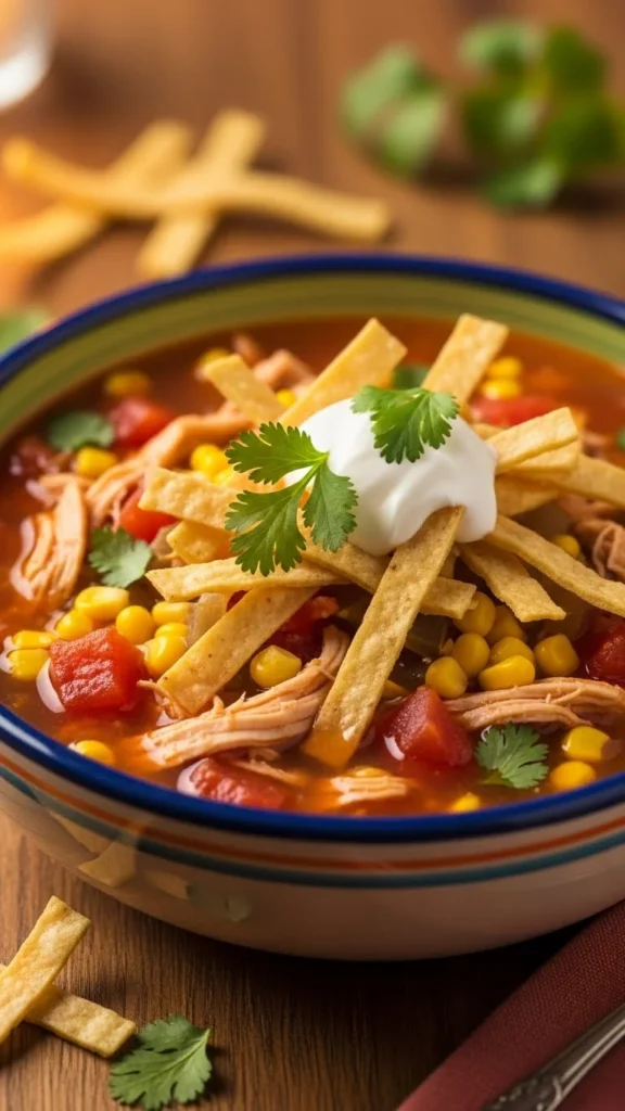 This soup is lively, warm, and packed with chicken, tomatoes, and spices. Crisp tortilla strips add texture while the broth stays flavorful and comforting.